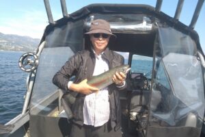 当初、移動日を設定してシェラン湖でヒメマス釣りをする予定でしたが、船を出す予定の方との都合が合わず、急遽サケ釣りに変更になりました。今回船を出してくれたのは、Youtubeのチャンネルももっているプロの釣りガイドのジェリーです。