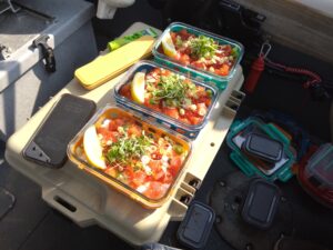 お昼前に切り上げて、船を引き上げてから船内でランチタイムです。